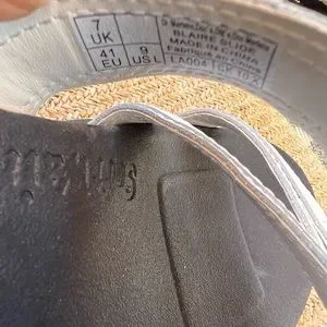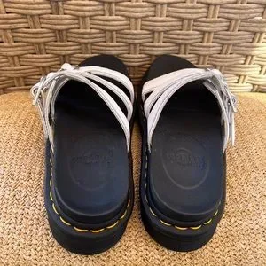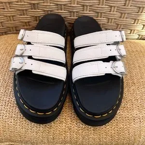 Stylish Dr. Martens sandals with white straps and black soles. Features triple buckle design.