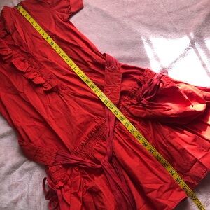 Red orange button up dress with ruffles. Two front pockets and waist tie belt with shoe lace strings