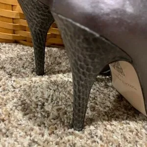 Stand out in these White House Black Market heels. Features a beautiful, caged gun-metal/ metallic grey upper. Embellished with gun metal gems. The sole and heel has a reptile/snakeskin print. 4.5" heel zips up. Including dust bag. NWOT.