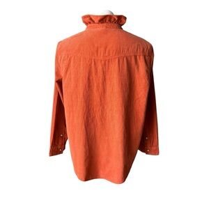 This Western inspired, soft corduroy shirt is beautiful with ruffles at the neckline for a feminine twist. Two patch pockets, snap closure and bandana print detail inside collar. 100% Cotton. Machine wash.