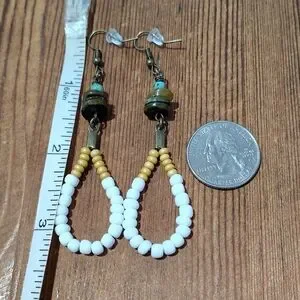 These elegant drop earrings feature a beautiful combination of white and gold beads, perfect for adding a touch of sophistication to any outfit.