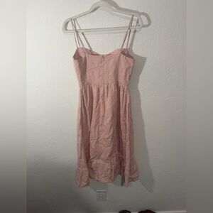 Elegant pink midi dress with spaghetti straps. Features a fitted bodice and ruffled hem.