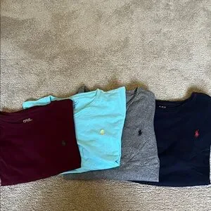 Four Ralph Lauren Polo T-shirts. Colors include burgundy, light blue, gray, and navy. Each features the iconic embroidered logo.