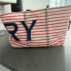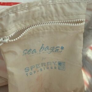 Speery and Seabags collab. Material is recycled sails! So cool! Very roomy! Easily fits multiple towels, clothes, sunscreen and more ! Makes a great beach or pool bag and a stylish overnight bag. Very durable, this was my go to, constant pool and beach bag for years. Bottom is worn, but no holes or rips.