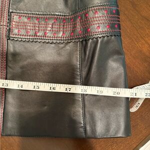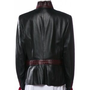 Chic black leather jacket with elegant red detailing. Perfect for stylish outings.