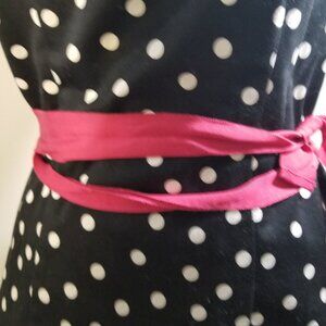 White House Black Market brand top black with white polka dot and pink belt. Side zipper, pink belt can be removed. Size 2. Used but good condition. No noticeable stain or rip.