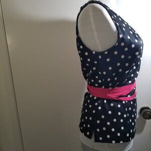 White House Black Market brand polka dot top in black with pink belt, size 2