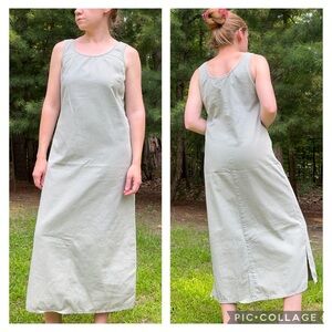 Vintage 90s sage green maxi tank dress by Nina Piccalino. Love this! Simple, but effective. 100% cotton, nice heavier weight canvas-like material. Made in USA. A-line style flows out a bit at bottom hem, but this is mainly straight up & down. Tagged Womenβs size 4 fits like a XS/S. Modeled on a S/M 34B 29β waist 5β5β and this is a nice long length on me, but too tight in the bust/across my wide shoulders. No stretch in material. Unisex. In good used condition w/no noticeable flaws besides this might be faded from wear. I love the earthy color though.