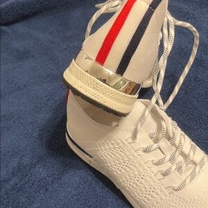 Chic white sneakers with striking red and blue stripes. Ideal for casual wear. Comfortable and stylish.