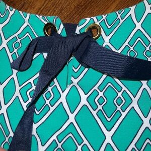 Crown & Ivy green with white geometric pattern long quarter wide sleeve, knee length sheath dress with black/ navy ribbon at the back of neck and outlines of the pattern with gold ring accents