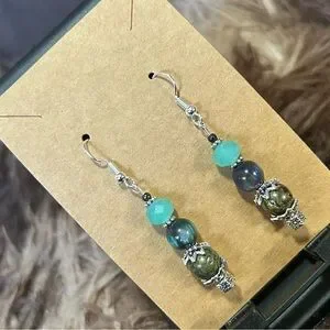 Handcrafted dragon blood stone cat eye glass crystal earrings, genuine dragon blood stone with cat eye glass; faceted glass crystal and hematite accents, sterling silver plated metal, fish hook backs, new on card as shown, 2 1/4” long.