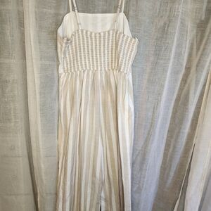Stylish beige striped jumpsuit with button accents. Ideal for casual outings.