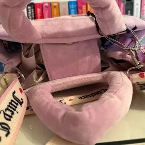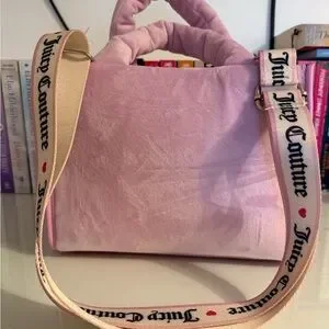 Elegant light pink velvet tote with sparkling logo. Heart-shaped charm adds a playful touch. Perfect for daily use.