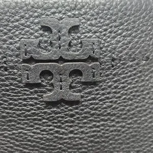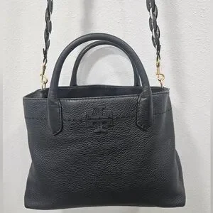 This Tory Burch Leather Mcgraw 2 Way Purse is a stylish and versatile medium-sized handbag made of black leather with gold hardware accents. It features a zip closure, double handles in multicolor, and inner pockets for organization. With a classic satchel/top handle bag style, this purse is perfect for everyday use and adds a touch of sophistication to any outfit. The unique design and quality materials make it a must-have accessory for women looking for both fashion and functionality.