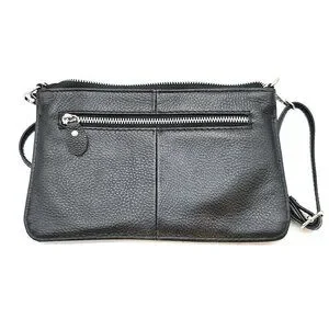 The bag closes securely with a full top zipper and includes an adjustable, detachable strap with silver-tone hardware for flexible styling options.