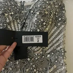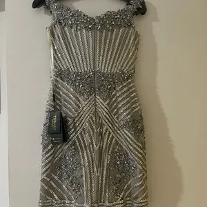 Dazzle in this metallic gown by Terani Couture. Features intricate embellishments and a fitted silhouette. Ideal for prom or special events.