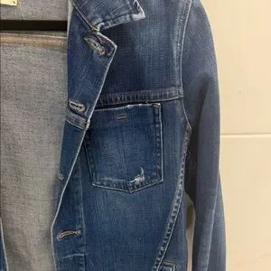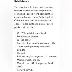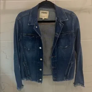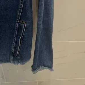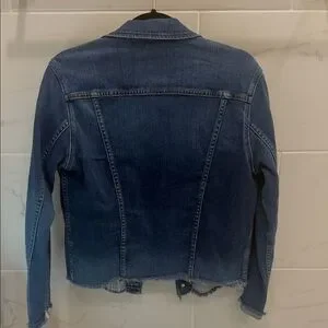 This jacket is still on Nordstrom app - FULL PRICE!! This is a STEAL!! Chic denim jacket with raw edges. Features front button closure and patch pockets. Bracelet sleeves with fold-over cuffs.