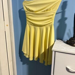 Chic strapless mini dress in vibrant yellow. Features a flattering ruched design. Perfect for summer outings.