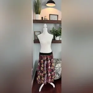 Elegant maxi skirt with colorful floral design. Perfect for versatile styling. Stretchy black waistband. Never worn, smoke-free home