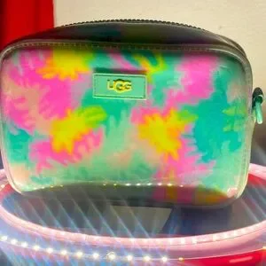Colorful UGG pouch with vibrant tie-dye design. Features pink, yellow, and teal hues.