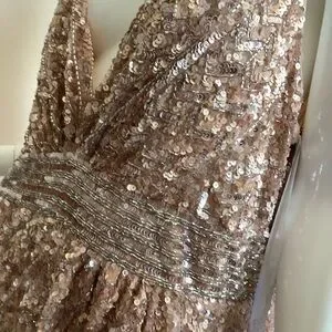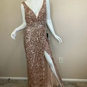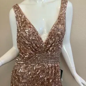 MacDuggal rose gold sequin evening gown with a deep V-neck and side slit and train. Perfect for formal occasions.