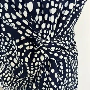 Experience timeless Parisian elegance with this stunning Maggy London wrap dress. Its sophisticated navy and white polka dot design, complemented by a unique asymmetrical hem and a chic front knot, creates a captivating silhouette. Made from a comfortable polyester-spandex blend, this dress is both stylish and easy to wear.