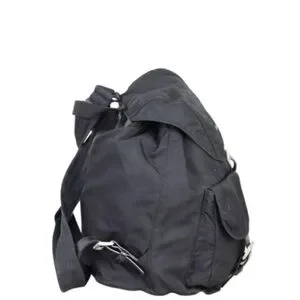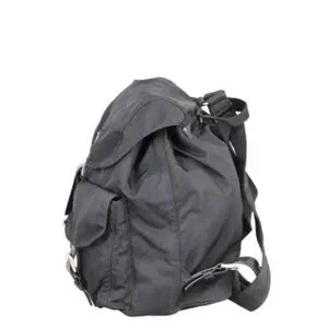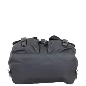 Specs- Black tessuto nylon exterior; silver tone hardware including Prada plaque logo with black enamel fill; black smooth calfskin leather trim; flat web top handle; double adjustable web shoulder straps; twin front exterior pockets with magnetic snaps and buckle entry; top flap opening with buckle closure and concealed magnetic snap; drawstring closure to main compartment; jacquard textile lined interior with zip pocket.