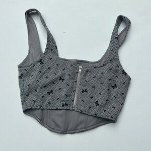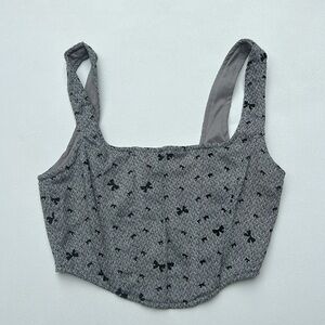 Stylish gray crop top with black pattern. Features a square neckline and sleeveless design.