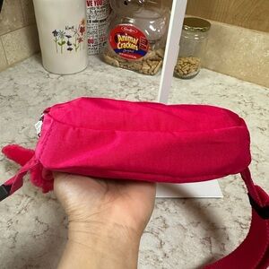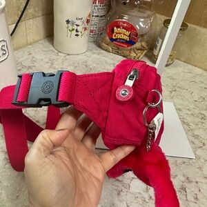 Vibrant pinkish red Kipling waistpack or belt bag or fanny pack featuring a playful monkey keychain or bag charm. Perfect for casual outings.