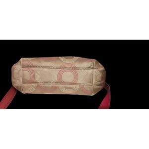 Stylish Coach crossbody bag featuring a signature circle optic design. This chic purse showcases a pink leather trim and accents, complemented by silver-tone hardware. It has a zip-top closure, an exterior back zip pocket, and an adjustable shoulder strap for comfortable wear.