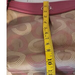 Keywords: Coach, crossbody bag, shoulder bag, purse, pink, signature, circle optic, designer bag, handbag, adjustable strap, zip top, casual, travel bag, accessories, women's fashion