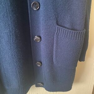 Navy blue button down with 2 pockets and white stripe accent on one arm. Never worn, so snags or pulling.