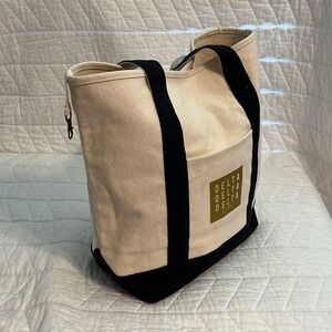 Back and natural colored canvas tote bag with a gold Tri-Delta logo on the front. Has canvas comfort handles, a pocket on the front, key ring holder, and Velcro closure. Has a flat bottom. Measurements: 16.5” high, base is 6.5” by 12”. Handles are 9.5”.