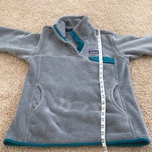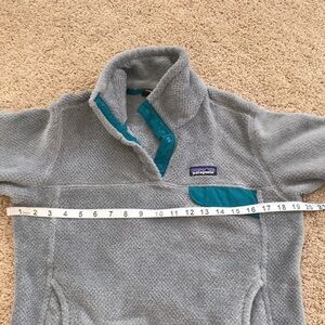 Patagonia Size medium grey with teal T snap fleece jacket. Gently used.