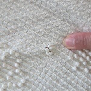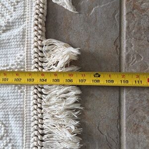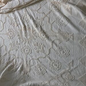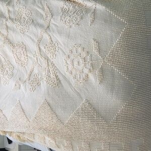 Vintage cream floral pattern chenille bedspread. Bates George Washington's Choice. Soft texture and floral tone on tone design. Tassels edges. It does have 2 holes at the bottom near one another and some stains. Stain removal not attempted.