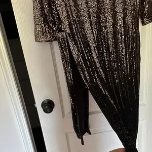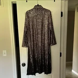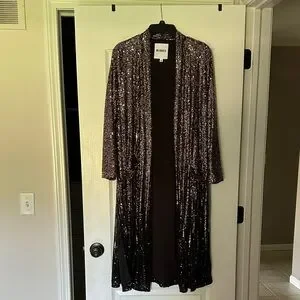 Elegant long jacket with shimmering sequins. Open front design. Perfect for evening wear.