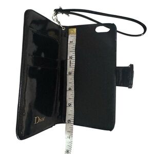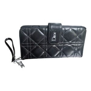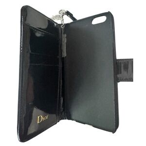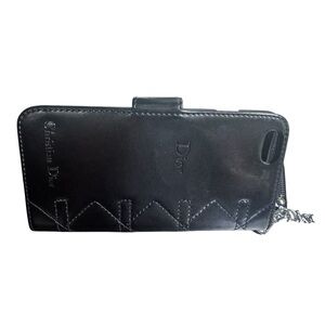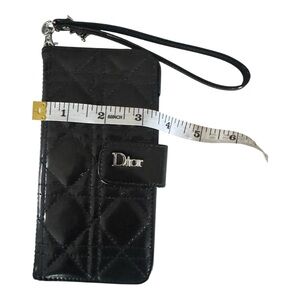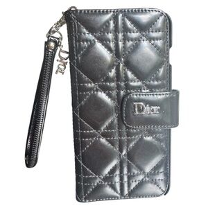 Dior quilted black phone case with wrist strap and signature “Dior” charm. Designed to fit iPhone 6 Plus, 6s Plus, 7 Plus, and 8 Plus. Features a sleek, elegant design that combines luxury with everyday functionality.