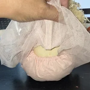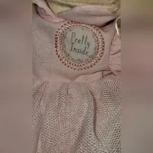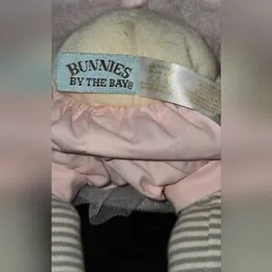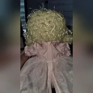 Adorable doll in a soft pink dress. Features charming striped legs. Ideal for playtime and cuddles.