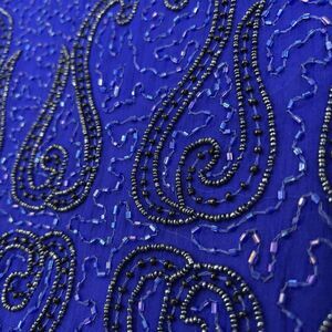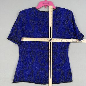 This exquisite vintage Stenay top in women's size Medium is crafted from 100% silk and features elaborate blue and black beading in a paisley design. It's a perfect statement piece for evening events, cruises, or any occasion where you want to add a touch of vintage glamour.