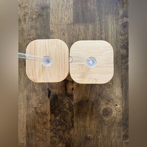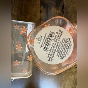 Set of two glass tumblers featuring a cute bear print. Comes with bamboo lids and straws. Perfect for beverages.