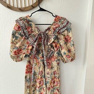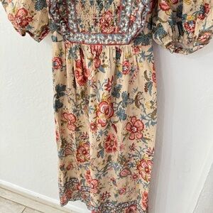 Sea New York Tess Smocked Puff Sleeve Brushed Floral Print Midi Dress Cream