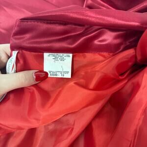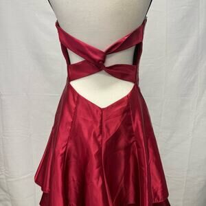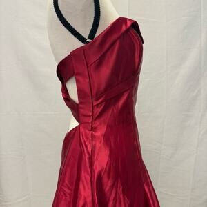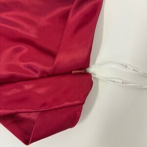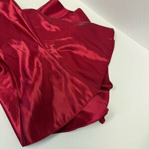 Make a bold entrance in this stunning vintage Jessica McClintock for Gunne Sax strapless cocktail dress. Crafted in a striking cherry red satin, this 100% polyester dress features a sweetheart neckline, structured bodice with twist front detail, and a flirty layered handkerchief hem. A rare, made-in-USA piece perfect for proms, parties, or collectors of iconic ’90s fashion.