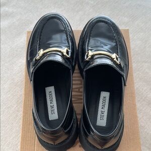 Chic black leather loafers by Steve Madden. Features a stylish gold accent. Perfect for versatile wear. Gently used. Size 9.