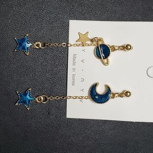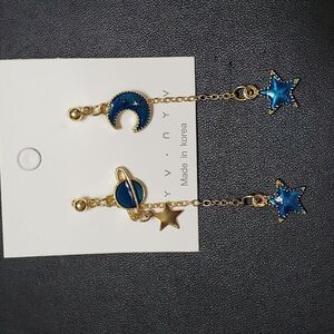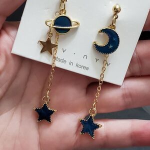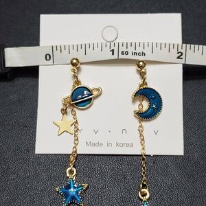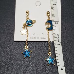 Adorable gold colored earrings with dangling stars, a moon and a planet in a pretty blue enamel.
