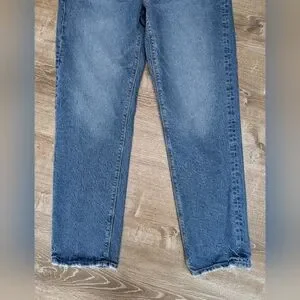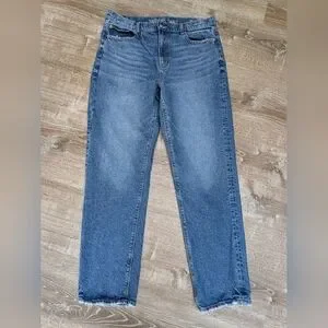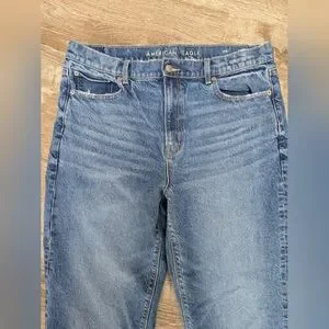 These are the Super High Rise Straight jeans from American Eagle. Classic medium wash with distressing on the hem and pockets. No stretch.