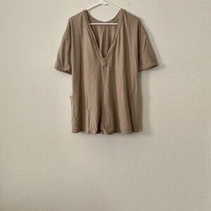 Features: Soft fabrication with a stretchy feel, scoop neckline, ribbed trim, patch pocket detail at front, V-shaped back, dropped sleeves, raw hemlines