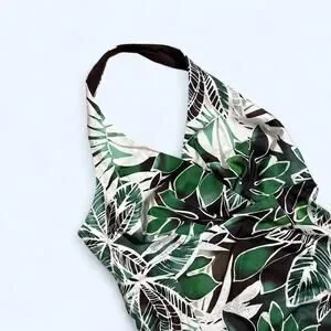 Turn heads in this bold tropical halter dress featuring a lush green, black, and white botanical print. The flattering ruched bust and fit-and-flare silhouette create a stunning shape. Perfect for beach getaways, summer parties, or resort lounging. Lightweight and breathable—your go-to piece for warm-weather glamour.