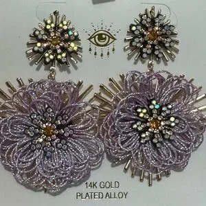 Chic floral earrings with gold and lavender hues. Sparkling accents for a stylish touch. 14k Gold plated.