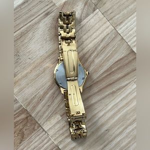 Description: Gorgeous watch with original box and additional links. Genuine Diamonds (tested and confirmed). White dial with date window. Gold-tone bracelet, hands, and dials. Just cleaned and serviced with a new battery installed. Works well!