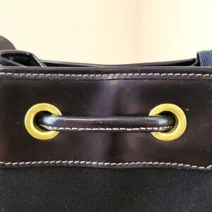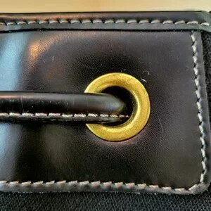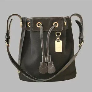 Step back into timeless American craftsmanship with this early 2000s Dooney & Bourke drawstring tote, proudly made in the USA. Crafted from durable, heavy-weight black canvas and accented with rich black leather trim and gold-tone hardware, this classic piece blends function and understated style.